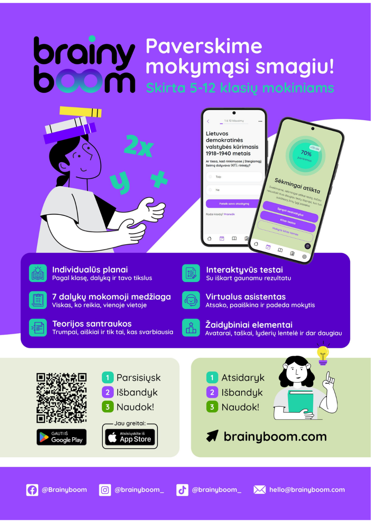 „Brainy Boom“ platformoje mokiniai ras mokomąją teoriją ir žinių patikrinimo testus pagal temas, kurios mokomos bendrojo ugdymo programoje. Šis įrankis puikiai integruojasi į privalomąją mokymo programą kaip papildoma mokymosi priemonė – jis leidžia mokiniams savarankiškai pasitikrinti savo žinias įvairiuose dalykuose, nustatyti spragas ir jas pagilinti.