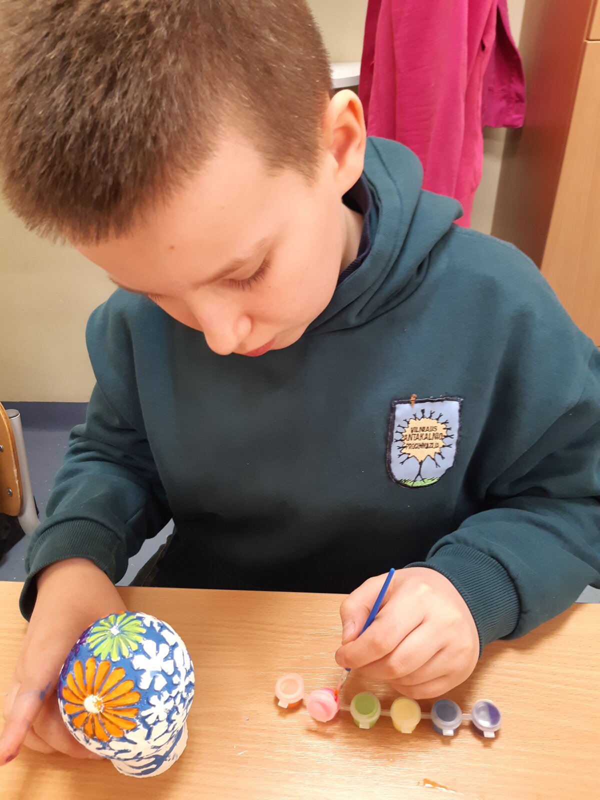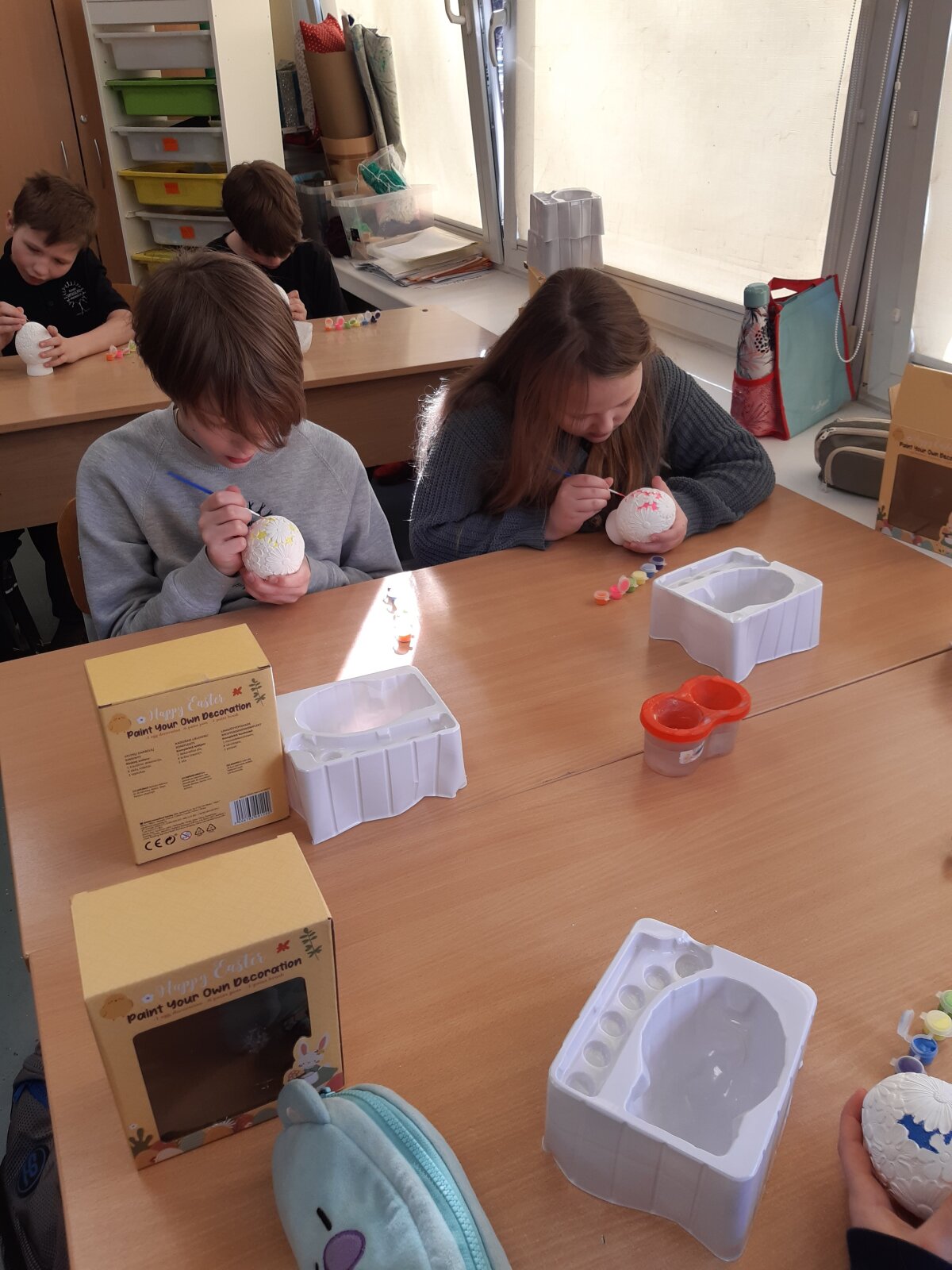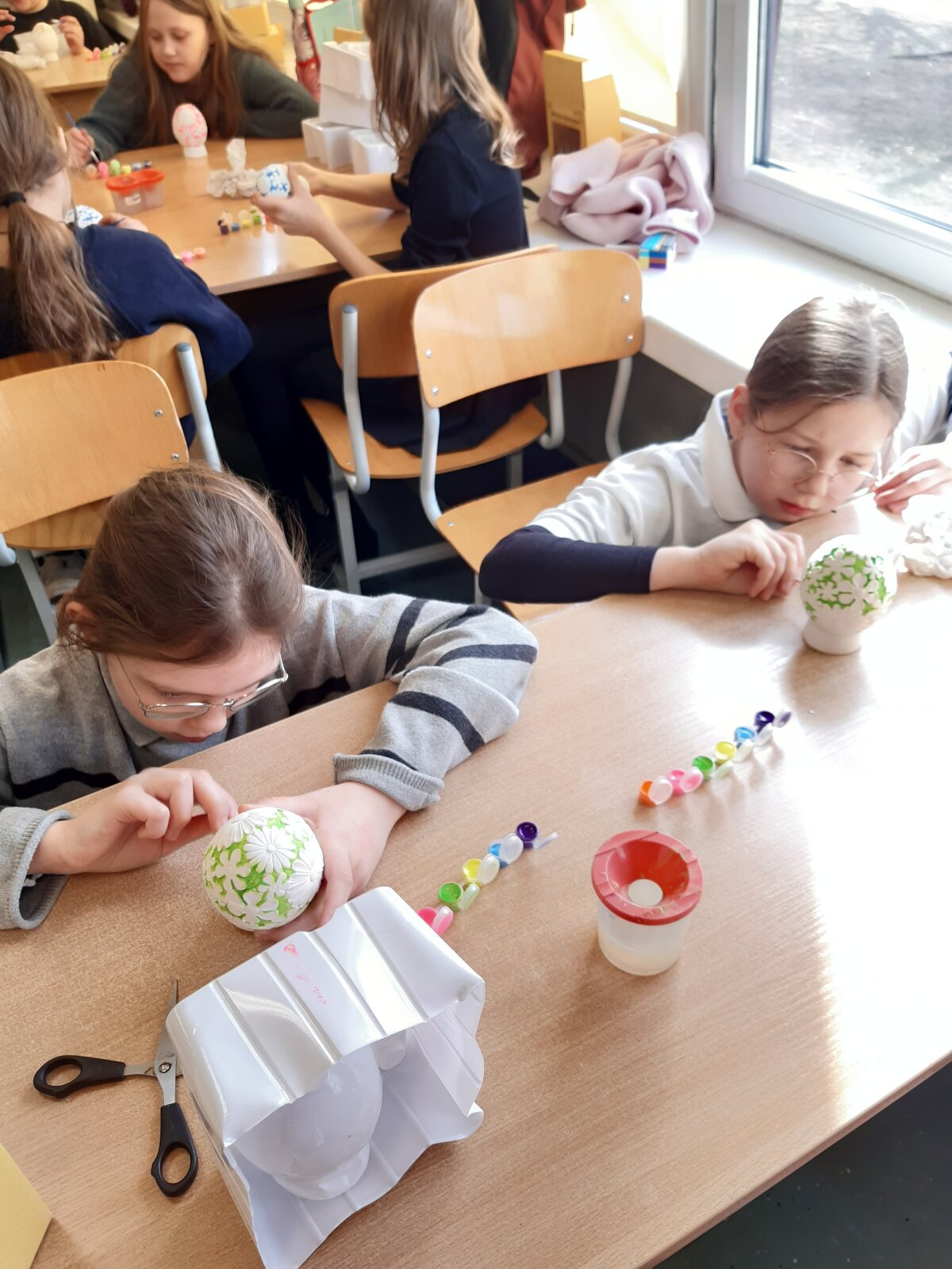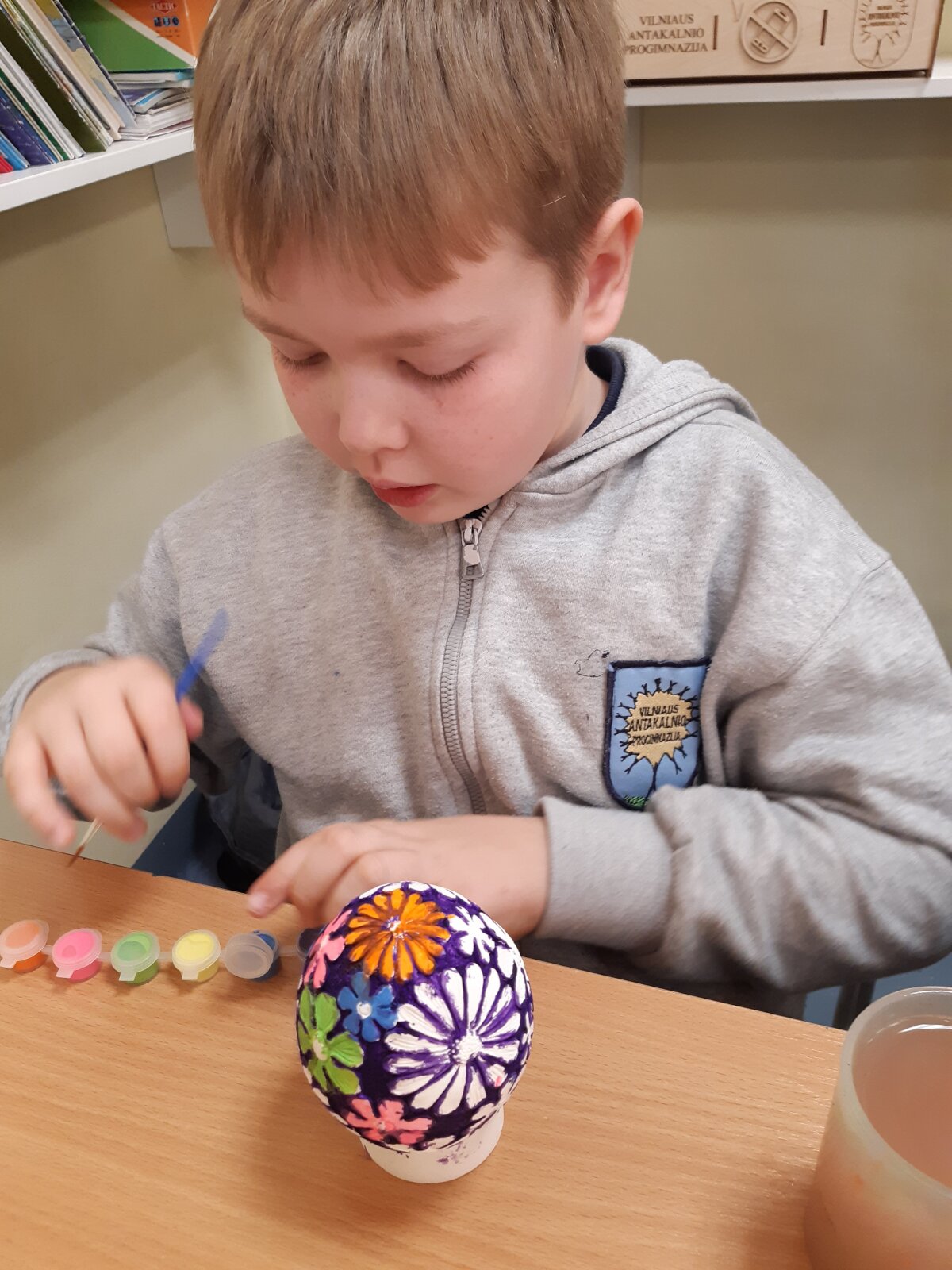 Susipažinus su kiaušinių marginimo Lietuvoje tradicijomis, mokiniai kiaušinių marginimo tradicijas interpretavo šiuolaikiškai – akriliniais dažais margino iš gipso padarytus kiaušinius. Ketvirtokai susipažino su skirtingomis medžiagomis (gipsas, akrilas) ir jų savybėmis, o balti gipsiniai kiaušiniai mokinių rankose virto spalvingais velykiniais simboliais.