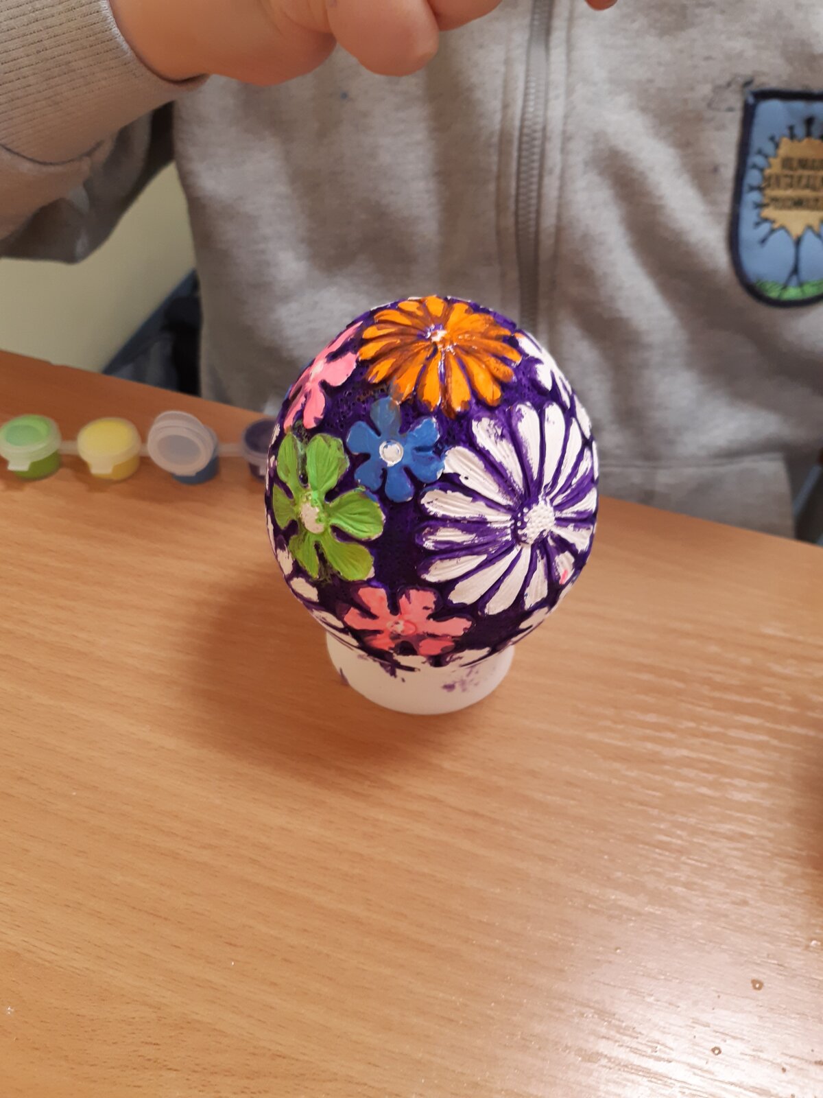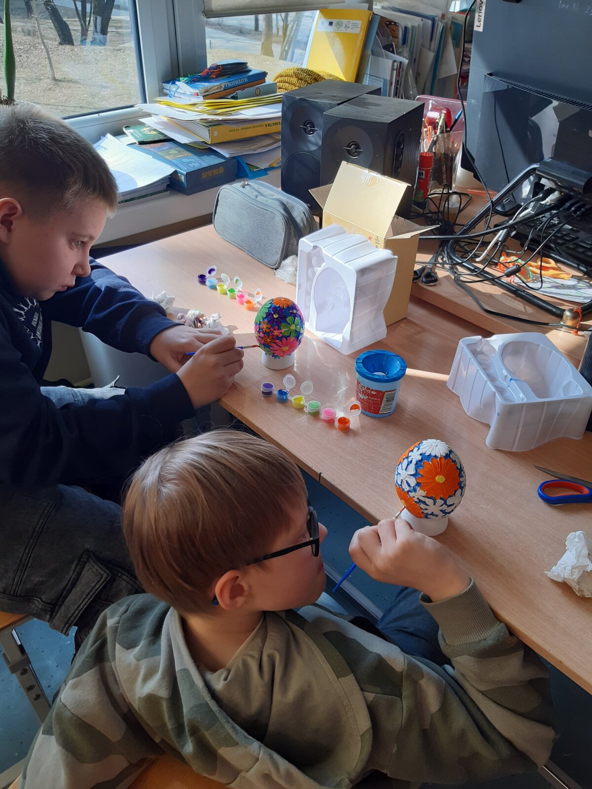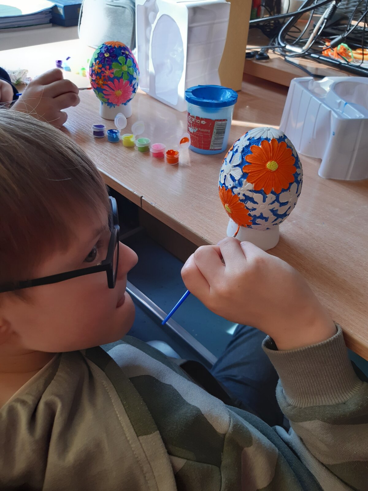 Susipažinus su kiaušinių marginimo Lietuvoje tradicijomis, mokiniai kiaušinių marginimo tradicijas interpretavo šiuolaikiškai – akriliniais dažais margino iš gipso padarytus kiaušinius. Ketvirtokai susipažino su skirtingomis medžiagomis (gipsas, akrilas) ir jų savybėmis, o balti gipsiniai kiaušiniai mokinių rankose virto spalvingais velykiniais simboliais.