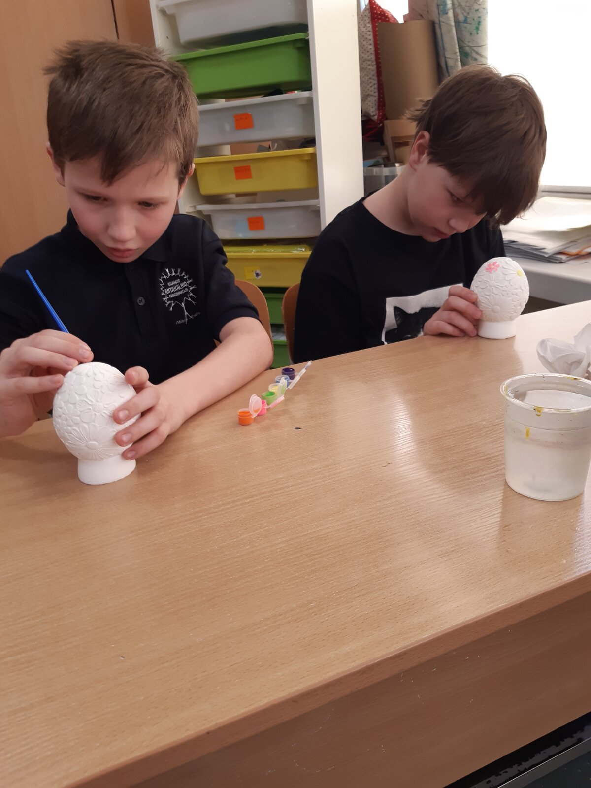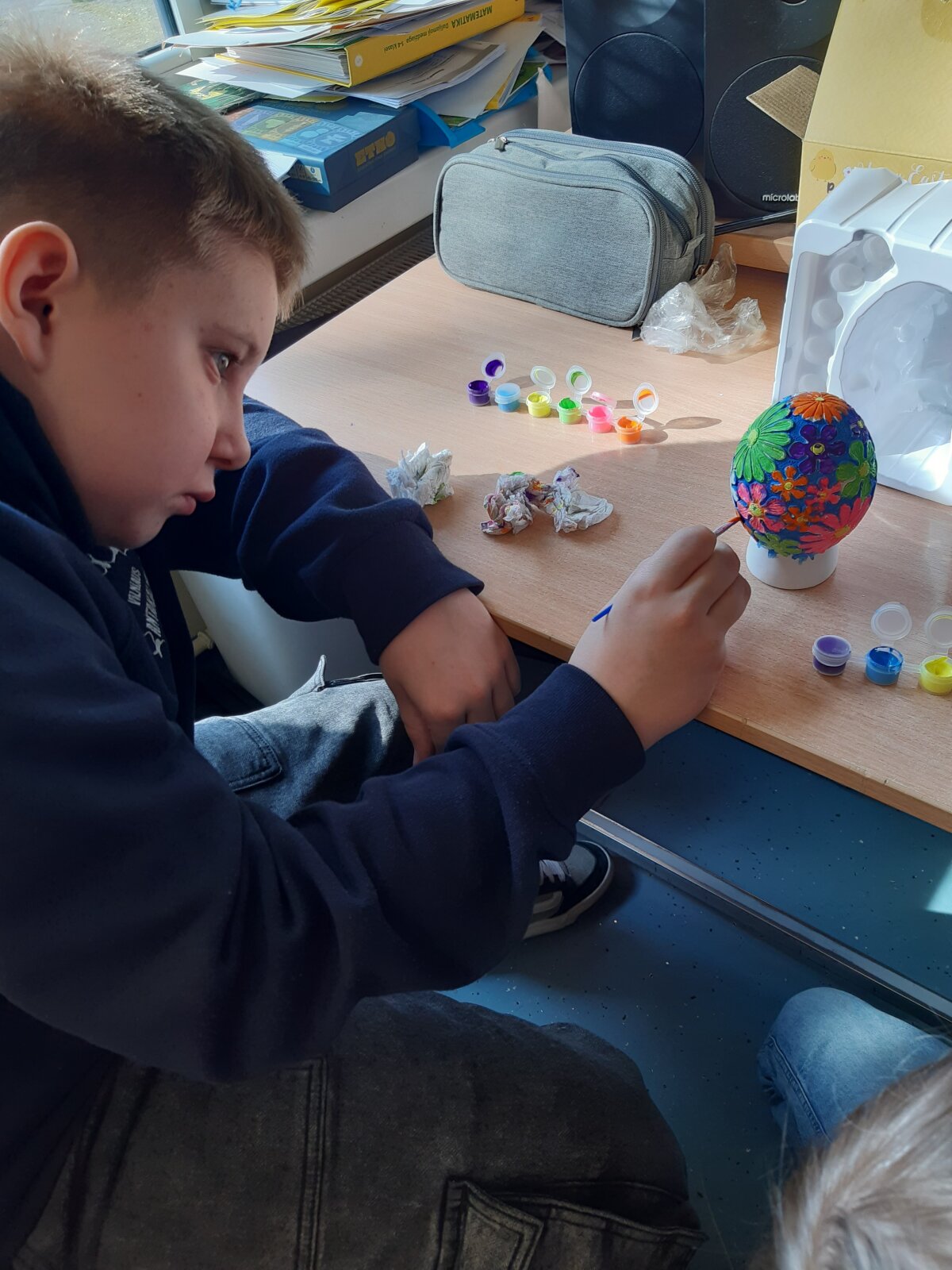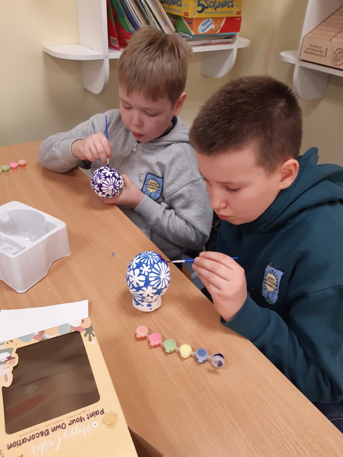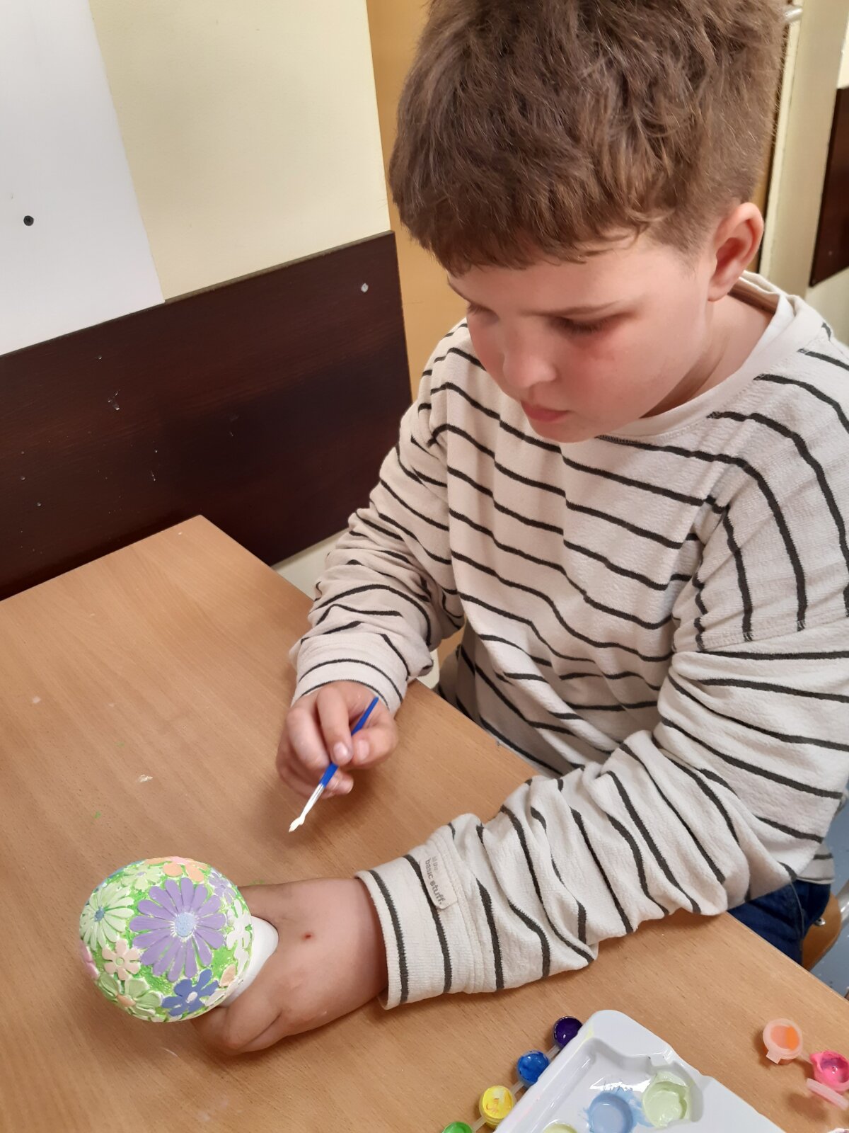 Susipažinus su kiaušinių marginimo Lietuvoje tradicijomis, mokiniai kiaušinių marginimo tradicijas interpretavo šiuolaikiškai – akriliniais dažais margino iš gipso padarytus kiaušinius. Ketvirtokai susipažino su skirtingomis medžiagomis (gipsas, akrilas) ir jų savybėmis, o balti gipsiniai kiaušiniai mokinių rankose virto spalvingais velykiniais simboliais.