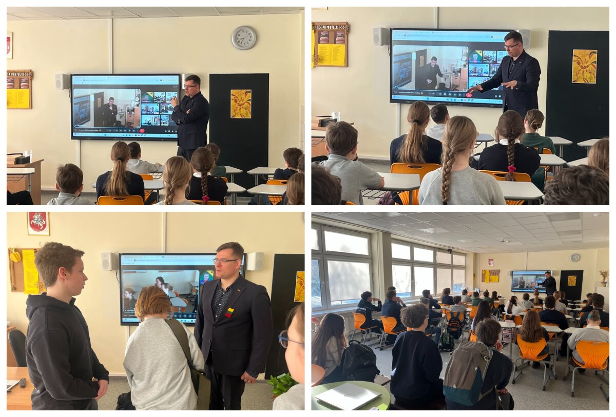 Šis šventinis susitikimas vyko hibridiniu būdu: klasių atstovai su svečiu diskutavo gyvai klasėje, o likusi mokyklos bendruomenė prie pokalbio jungėsi nuotoliniu būdu. Toks formatas leido užtikrinti betarpišką ryšį su politiku ir suburti visus mokinius kartu prisiminti kaip buvo atkurta Lietuvos nepriklausomybė.
