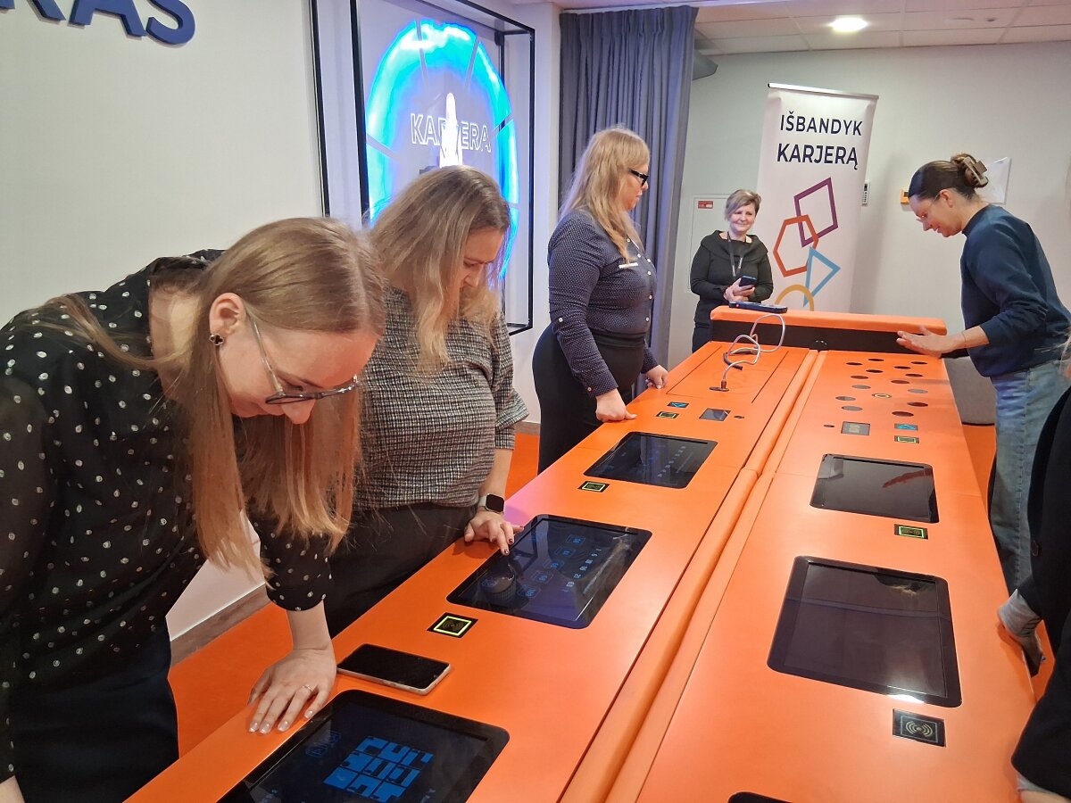 Siekant užtikrinti kokybišką ir šiuolaikišką ugdymo karjerai procesą, karjeros specialistė bei socialinės pedagogės neseniai lankėsi regioninio centro „Karjeras“ interaktyvios erdvės pristatyme. Tai pirmoji Lietuvoje ir Baltijos šalyse skaitmenizuota ir inovatyvi karjeros planavimo erdvė, kuri atveria galimybes mokiniams pažinti save, atliekant užduotis, naudojant inovatyvius asmenybės testus, „pasimatuoti“ profesijas, pasiruošti darbo rinkai - išbandyti save simuliaciniame darbo pokalbyje, įvertinant ne tik atsakymus, bet ir kūno kalbą. Planuojame artimiausiu metu su šia erdve supažindinti ir mokinius ir kartu išbandyti jos galimybes.