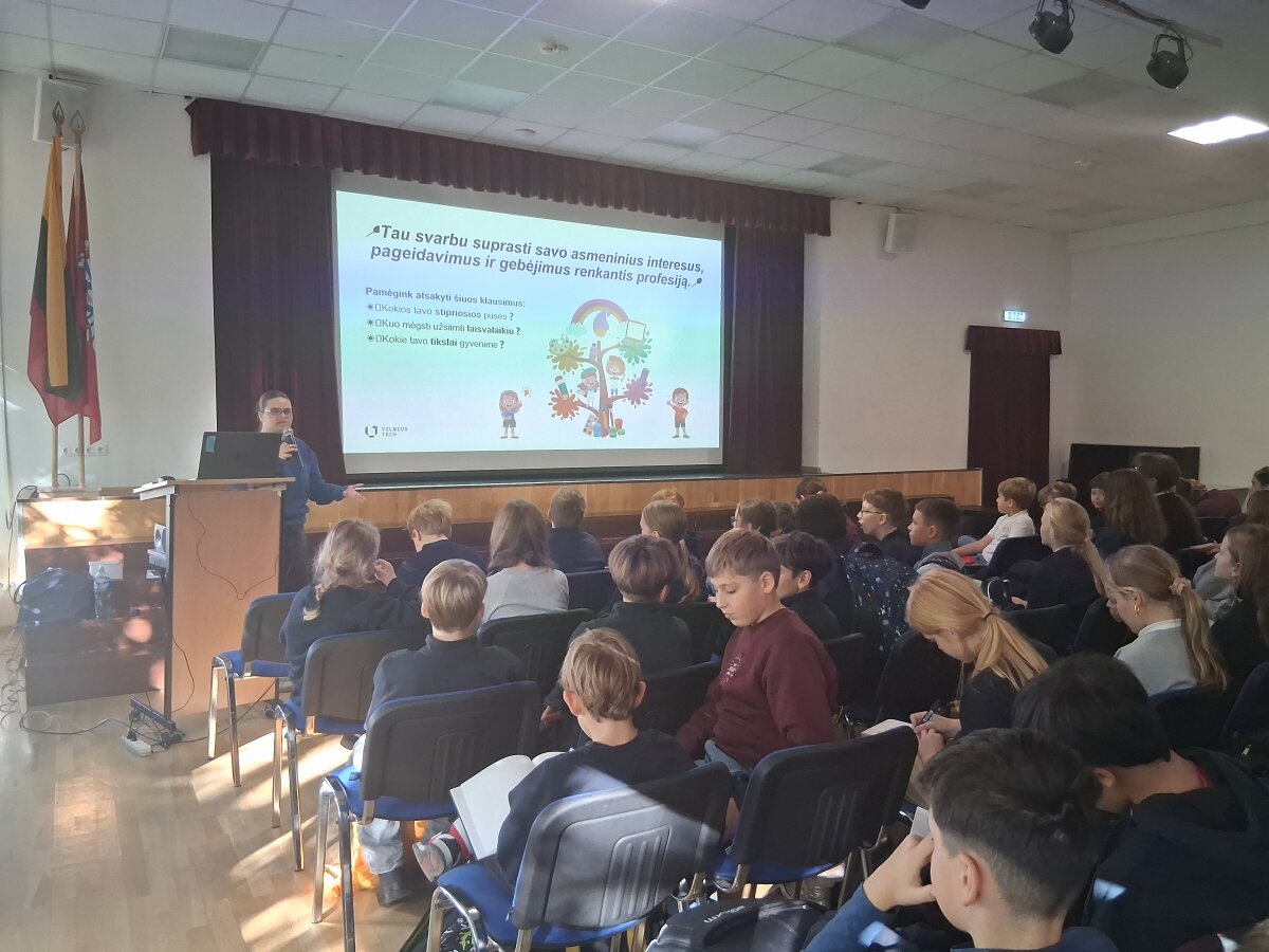 Mūsų mokykloje neseniai apsilankė pranešėja iš Vilnius Tech universiteto. Šis vizitas nebuvo tik įprastas universiteto programų pristatymas, o tapo įkvepiančia diskusija apie mokslo sritis, ateities profesijas ir naujausias technologijas. Renginyje dalyvavo penktos ir šeštos klasės.