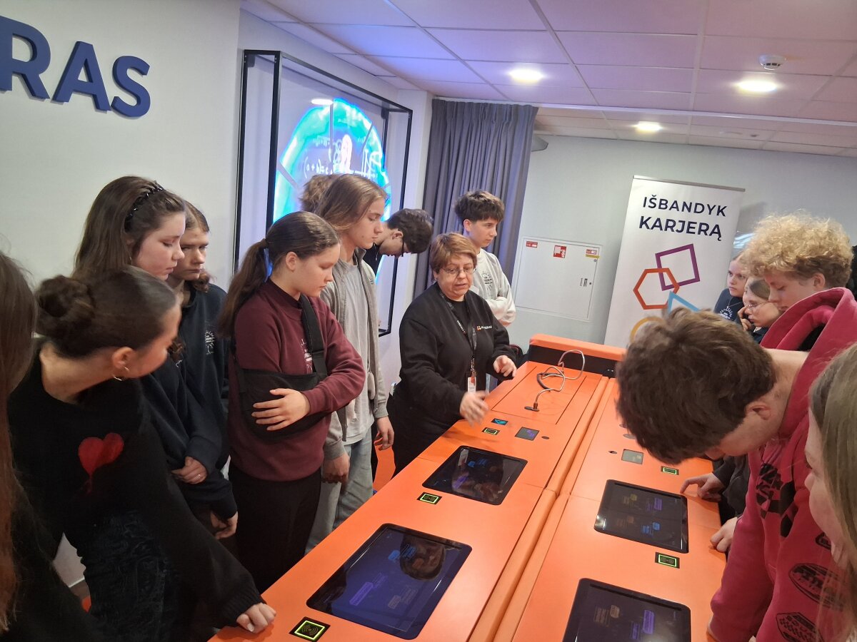 Kartu su aštuntokais lankėmės modernioje interaktyvioje erdvėje „Karjeras“, kur mūsų laukė netradicinė pamoka apie ateities pasirinkimus. Tai buvo vertinga patirtis, kurioje mokiniai išbandė netikėtus metodus, padedančius ugdyti karjeros kompetencijas. Pasitelkdami skaitmeninius testus ir praktines užduotis, aštuntokai galėjo įsivertinti savo pomėgius, gebėjimus, asmenines savybes bei sužinoti, kokios profesijos jiems galėtų būti artimiausios. Daug susidomėjimo sulaukė ir interaktyvūs darbo pokalbiai, kurie padeda pasiruošti realioms darbo paieškos situacijoms.