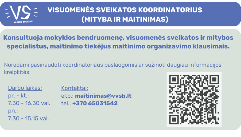 Dėl klausimų, susijusių su mokinių maitinimu, prašome drąsiai kreiptis į VšĮ „Dvylika žirnių“ darbuotojus: